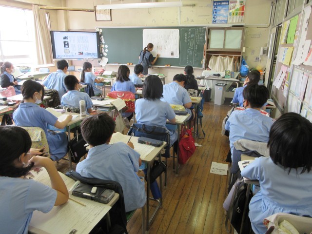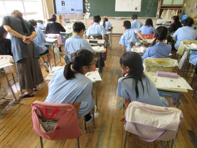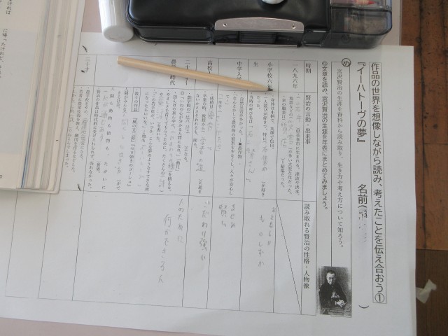 国語では宮沢賢治の伝記の読み取りをしています。長い文章ですが、ワークシートのそれぞれの時期の賢治の言動や出来事を整理し、そこから賢治の性格や人間像を読み取っています。それぞれの感じ方や考え方は違うので、2人組で読み取ったことを話し合って、見方を広めています。宮沢賢治の生き方から、自分の生き方や人生の目標についても考えていきます。