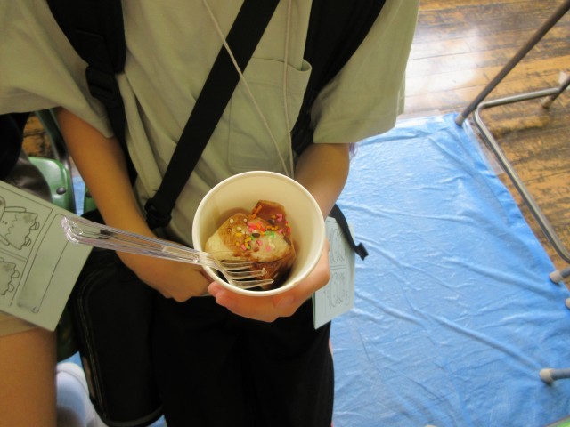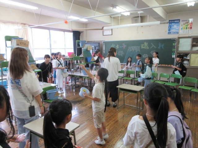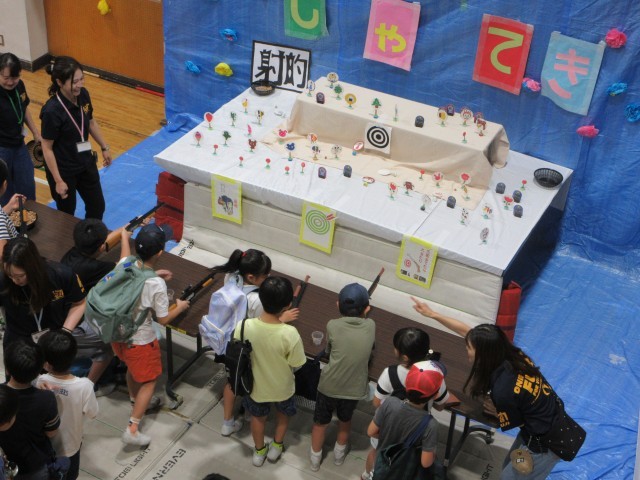 体育館では、射的、スリッパシュート、ストラックアウトなどのブースがありました。また、3階の各教室では香水作り、水中コイン落とし、富士っ子玉入れなどがありました。