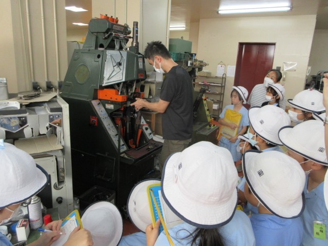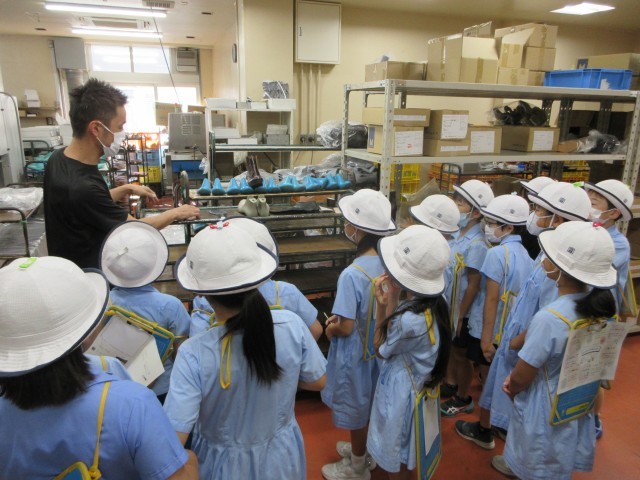 御厚意で近隣の靴工場の見学をさせていただきました。3年生の社会科には台東区の伝統的な産業である靴工場の学習があります。子供たちは教科書を使って材料や作り方、働く人の工夫について学習しましたが、実際に見るのでは学びの深さが違います。機械を使って効率的に進める作業、機械ではできない細かなところを手作業で行っている様子など、ていねいに説明しながら実際にして見せて教えてくださいました。子供たちは一所懸命に聞いていました。学校に帰ってからもワークシートにその様子を記入していました。靴工場の皆さん、ありがとうございました。