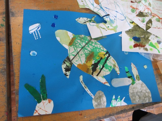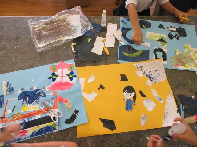まず、自分いろがみを作ります。白い画用紙に、絵の具と筆で色を塗ったり、色のついたビー玉を転がしたり、スパッタリングをしたり、ローラーでぬったり・・・と様々な手法でテイストの違う自分いろがみを作ります。次にそれをイメージする形に切って色画用紙に貼り、物語を作ります。具体的なものを表したもの、抽象的なイメージの世界を表したもの、それぞれの思いで、個性あふれる作品ができました。自分で作ったいろがみを生かそうと、子供たちはどうしたらいいかをじっくりと考えながら取り組んでいます。
