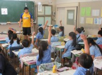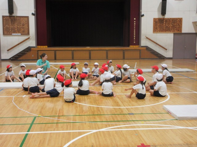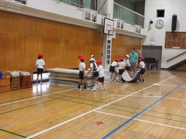 1年生のマットを使った体育は、『運動』ではなく『あそび』です。前転や後転などを練習するのではなく、マットの上で子供たちがさまざまな転がりあそびをする中で、おもしろい動きを見付けて、それを身に付けていきます。先生は、子供の面白い動き、この先運動につながっていくような動きを紹介し合いながら学習を進めています。マットを片付けるのも学習のうちです。ルールを守り、みんなで協力する態度も育てています。