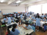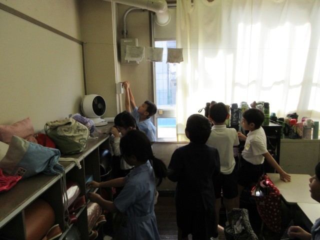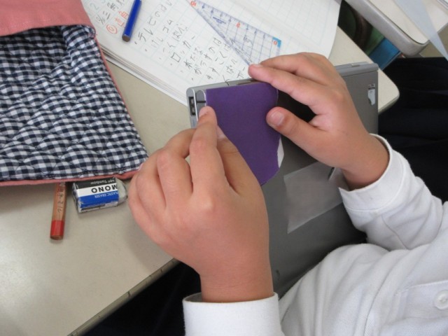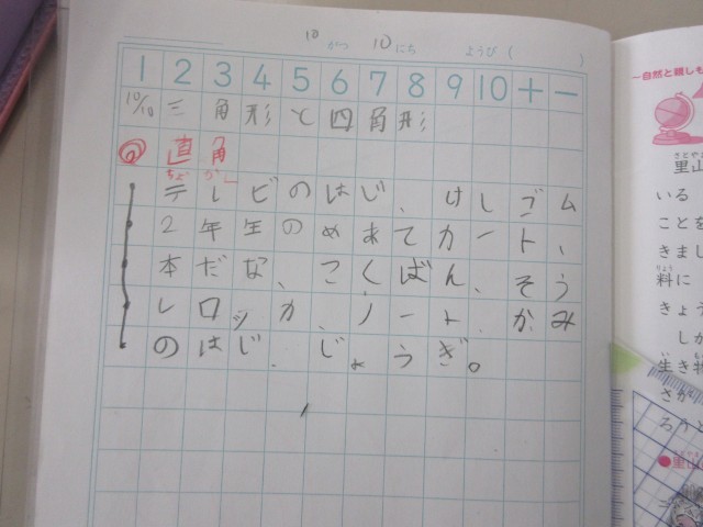 算数の図形についての学習で、初めて直角について学びました。折り紙で作った直角を使って、早速、直角さがしを始めました。おどうぐ箱からノートなどを引っ張り出したり、教室中を歩き回ったりして、タブレットの角、ロッカーの仕切り、黒板やテレビの角、窓枠・・・次々に直角を見付けていきます。中には10個近くも見付けてノートに書いている子もいました。子供たちは夢中になって、「みつけた!」と探していました。大人にとっては当たり前の直角も、子供とっては新鮮な発見です。おうちでも直角さがしをしてみませんか。こういう体験的な活動をたくさんしている中で、単に直角を見付けるだけでなく、「長方形のまわりには直角が4つある。」、「直角でないのはどんなところにあるのだろう?」、など次の学年の算数への理解や興味は深まっていきます。