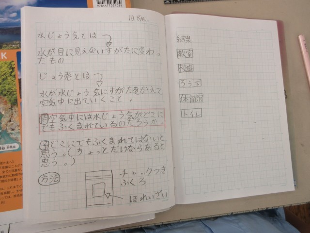 今日の問題は『空気中には水蒸気がどこにでも含まれているのだろうか』です。子供たちは今までの経験や学習してきたことをもとに予想を立てます。よそをするときには理由や根拠を考えますので、仮に予想が間違っていたとしても大きな学びになります。そして実験方法を考えて、実験します。子供たちは教室、校庭、体育館、トイレなどで調べたいと意見を出しました。この話し合いのときにも、「ここには絶対にある!」、「ここはすずしいから少ししかないと思う。」など結果についてさらに詳しく予想を立てていました。実験は凍らせた保冷剤をそれぞれの場所に置いて、空気中の水が付くかを確かめる方法です。体育館にセットしたグループは「水があった!」と歓声を上げていました。
