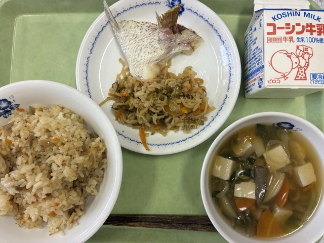 献立:牛乳、きんぴらご飯、鯛かま焼き、切り干し大根ごま酢和え、けんちん汁