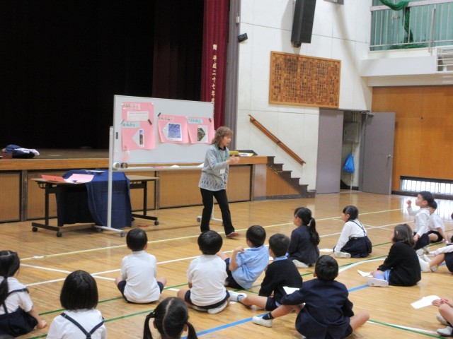 10月14日、台東区教育委員会から『民話と伝承遊び』の皆さんが来てくださいました。これは、子供たちが日本の伝統文化に触れる機会を大切にしようと台東区教育委員会が行っている事業です。
