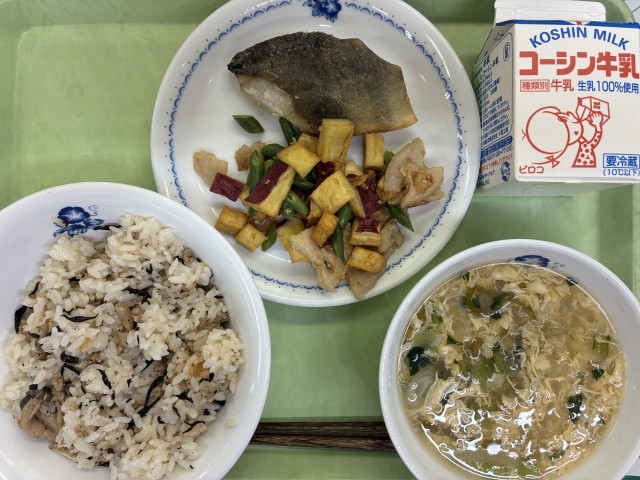 献立:牛乳、ひじきご飯、ほっけ一夜干し、れんこんとさつまいもの甘酢和え、かきたま汁