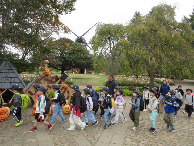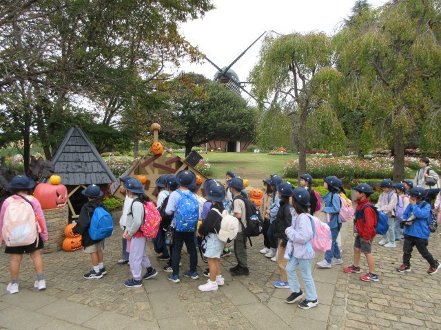 お弁当の後は、少しドングリ拾いをして、園内を散策しました。コスモスが満開に咲いていたり、ハロウィンの飾りがあったり、秋の雰囲気を味わいながら歩きました。