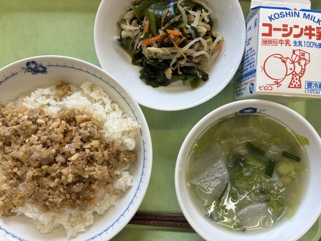 献立:牛乳、ルーローハン、もやしのごま醤油和え、ルオボーダン