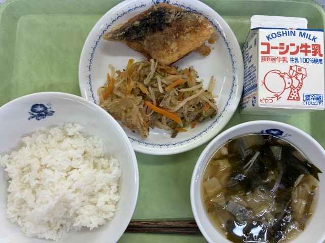 献立:牛乳、ご飯、さばのピリ辛揚げ、野菜と春雨の甘酢煮、みそ汁