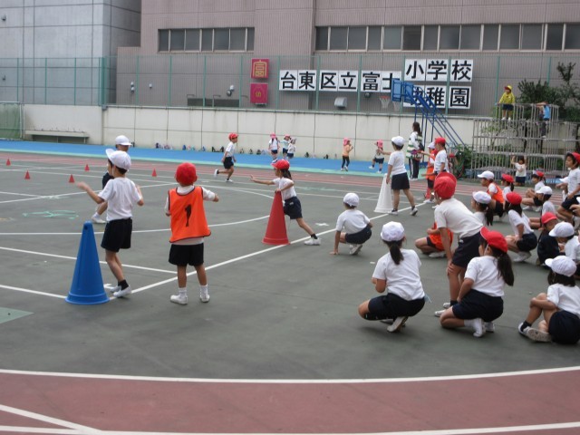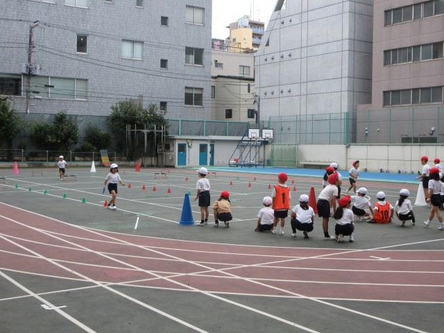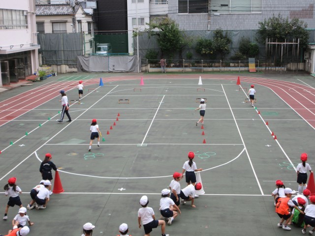 校庭での体育では、折り返しのリレーに取り組んでいます。ミニコーンをジグザグに走り、ミニハードルを飛び越えて折り返してきます。はじめはぎこちない動きでしたが、体をうまく倒してジグザグ走をしたり、リズムよく飛び越えたりしてだんだん上手になってきました。走り方に慣れてくると競争に意識が向き、自分のチームを応援する大きな声が校庭に響いていました。みんな、ルールを守り、楽しく走っていました。