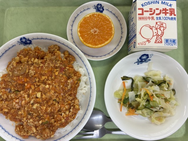 献立:牛乳、スパイシートマトライス、アップルソースサラダ、みかん