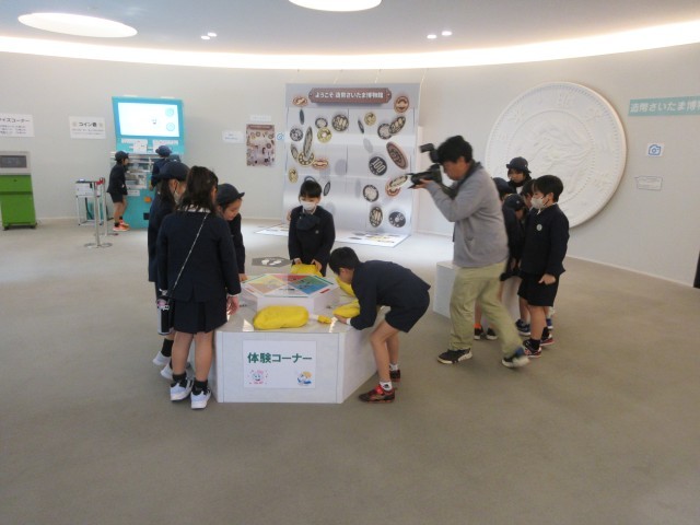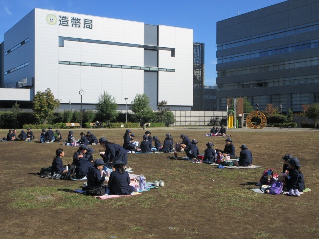 まずは、造幣局横の広場でお弁当を食べました。そして、見学です。ビデオを見て、硬貨の作り方や偽造を防ぐための工夫などを学びました。工場を見学した後、体験コーナーで遊びました。
