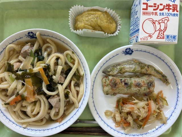献立:牛乳、わかめうどん、ちくわとししゃもの磯辺揚げ、キャベツの辛子和え、スイートポテト