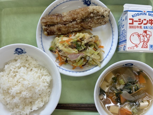 献立:牛乳、ご飯、さんまの蒲焼き、野菜炒め、けんちん汁