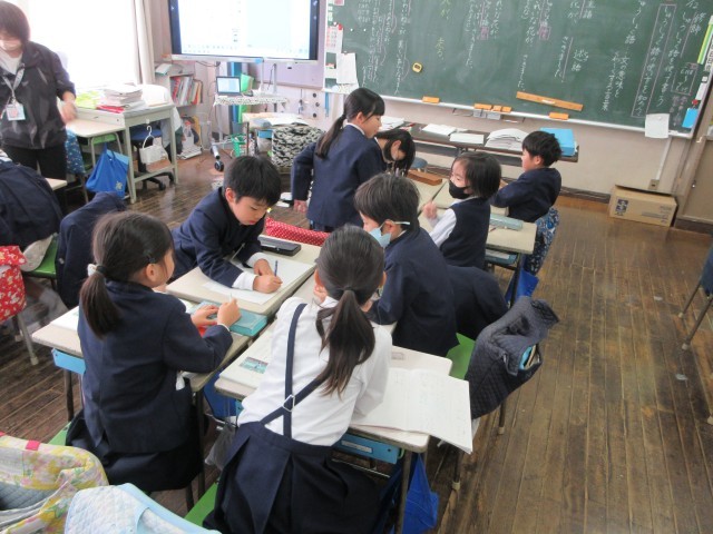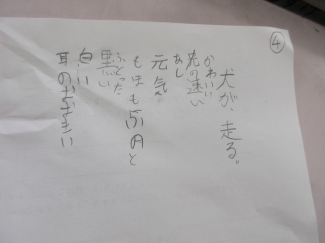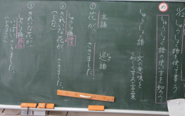 今日のめあては『修飾語の使い方を知ろう』です。3年生では早くも文法の学習が始まります。修飾語は少し難しいのですが、先生の説明で『文の意味をくわしくする言葉』ということが分かりました。授業の最後には修飾語を作るゲームをしました。3分間で『犬が 走る』という文にできるだけたくさんの修飾語をつけるというゲームをグループ対抗戦でしました。『かわいい』、『足の速い』、『元気な』・・・とみんなで順番に修飾語を出し合いました。協力し、みんなで楽しみながら、修飾語の使い方を身に付けていました。