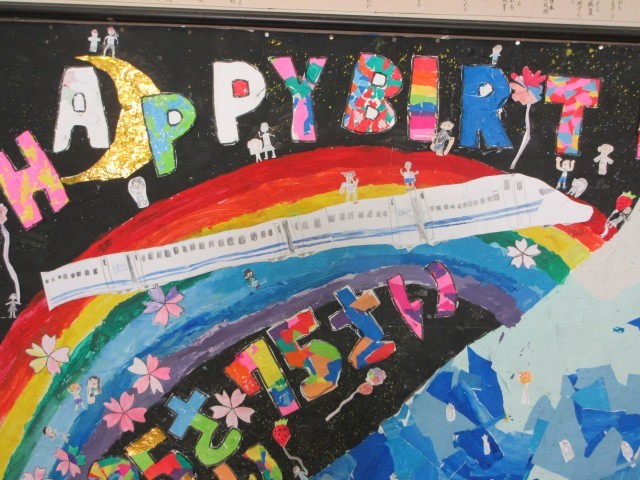 2年生は富士小学校の創立125周年、富士幼稚園の創立75周年を祝って、玄関の壁面に大きな作品を飾ってくれました。2クラスが2週間かけて作り上げた大作です。文字を切ってきれいに色を塗る人、切り絵で富士山や太陽をえがいた人、にじをえがいた人、新幹線、スカイツリー、雷門などをかいた人、それぞれが『おめでとう』の気持ちを込めて役割を果たしました。そして、一人一人が『自分』をえがいて好きなところに貼りました。