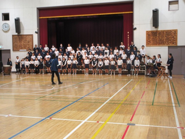 4年生は『お祭り』の群読です。速い言い回しもあり、そろえて読むのはなかなか難しいのですが、だんだんみんなの気持ちがそろってきました。元気いっぱいの群読になってきました。太鼓のリズムに合わせてがんばっています。1回1回の練習で高まっていくように真剣に練習を重ねています。