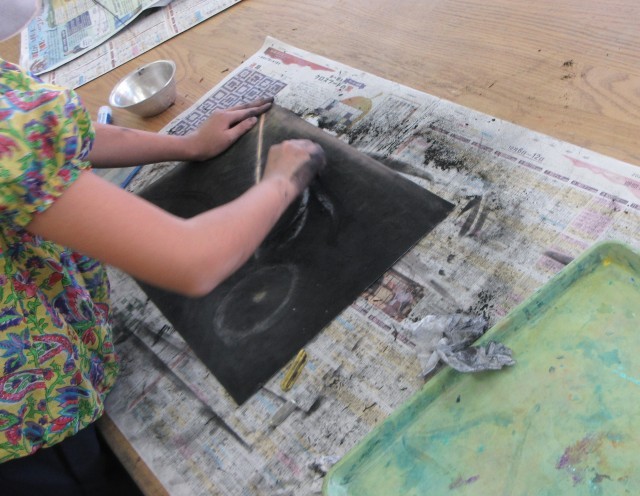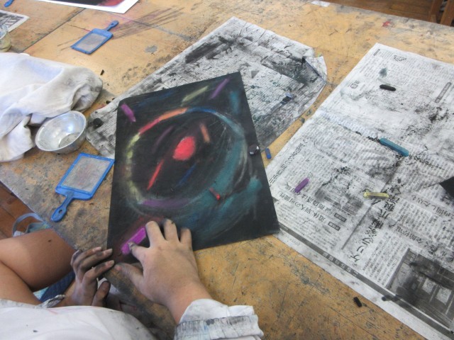 黒のコンテを紙一面に塗って、消しゴムで消して線を書き、自分のイメージに合わせて色付きのコンテで彩色しました。