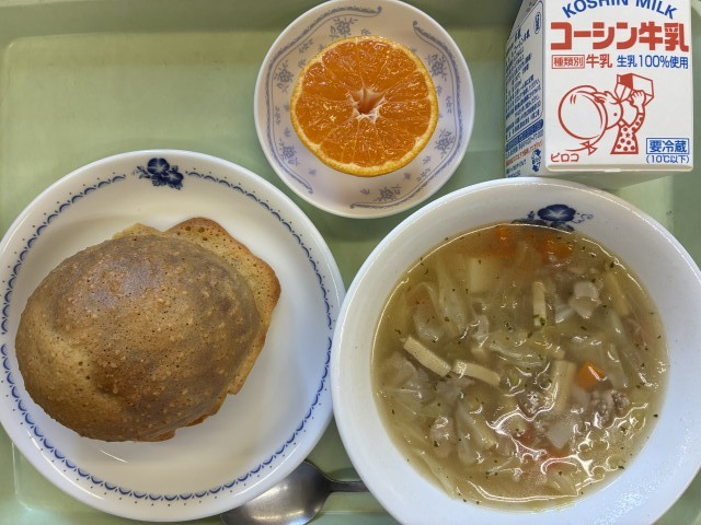 献立:牛乳、ごまビスキュイパン、田舎風スープ、みかん