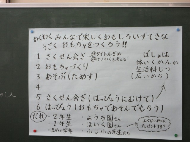 ただ、作って遊ぶだけではもったいないと、その発表会も考えています。誰に紹介するのか、どのように楽しんでもらうのかなど、具体的な発表場面を意識して、それに向けて準備を進めています。楽しみながらも、「幼稚園の子にもわかりやすいルールにしよう。」など考えながら準備を進めています。今から発表会が楽しみです。