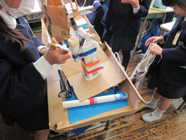 生活科では、こま、ゴムの力を使ったロケット、車などのうごくおもちゃを作っています。