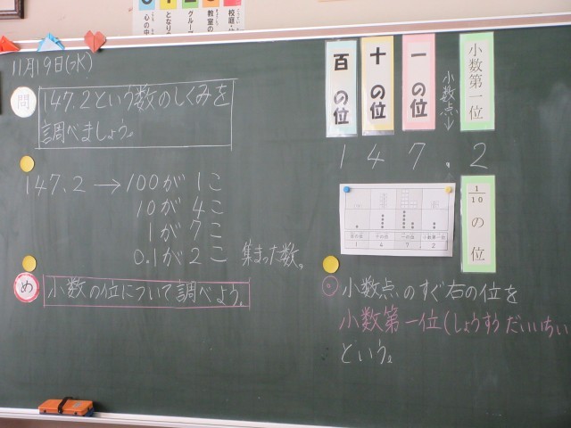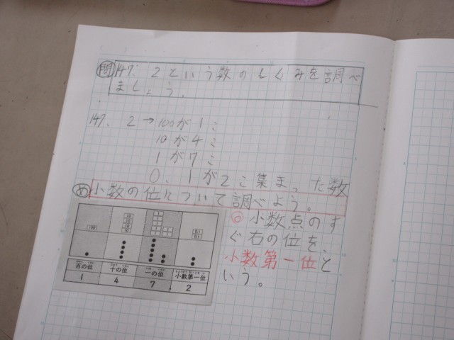 整数では表せない間の数を表すのに小数を使います。子供たちがしっかりと理解できるように、位取り表を使ったり、ブロックで表したり、いろいろな表し方をしています。少し難しいからこそ、子供たちはがんばって学習しています。