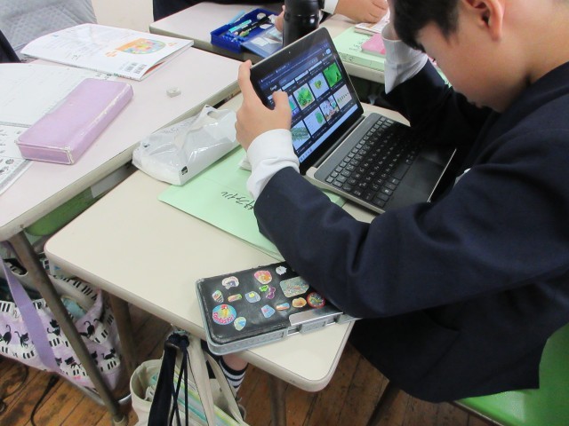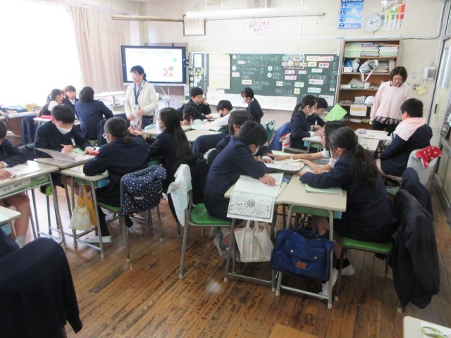 6年生の家庭科では献立作りをしています。同じ学習なら実際につなげようと、『富士小のみんなが喜ぶ給食の献立を作ろう』というテーマでグループで献立作りをし、そのうちいくつかは3学期の給食の献立として採用されます。栄養、味のバランス、いろどり、費用を大事に考え、また地産地消や郷土食も意識しながら考えています。栄養については食品成分表を見ながら考えたり、栄養士の先生にもアドバイスをもらいながら、バランスを取っています。ネットから郷土食を調べている子もいました。実際の給食になるのが楽しみです。
