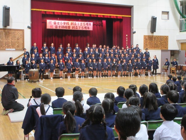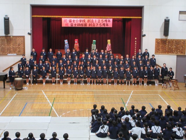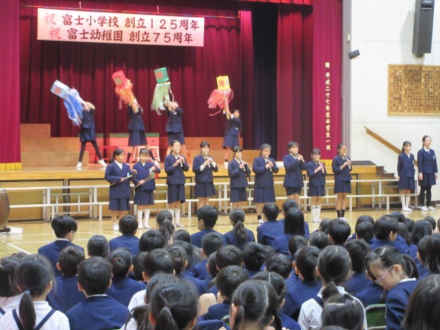 4年生のタイトルは『125周年 ふじっ子まつり』です。北原白秋の詩『お祭り』の群読ですが、子供たちの思いで一部詩を差し替えて、富士っ子の心意気を盛り込みました。リコーダーでのお囃子、元気のいい纏から始まりました。練習を始めた頃は、うまくリズムにのれずに途中で止まってしまうこともありましたが、練習を重ねるごとにどんどんうまくなり、迫力のある群読になりました。会場からも自然と手拍子がわき起こりました。一人一人が富士っ子魂を込めて、心を合わせた群読になりました。