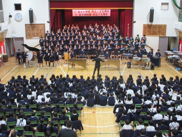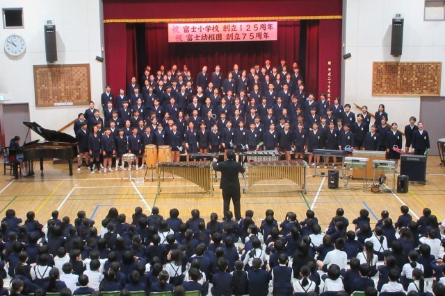 5・6年生、2学年がステージに上がるため、ステージ上にも何段かひな壇を置きました。特に合唱のときに子供たちが富士山の形に見えます。これは意図したのではなく、『奇跡』です。富士山な形になった子供たちが、気持ちを合わせて歌いました。6年生は5年生の元気のよさから刺激を受け、5年生は6年生の立派な頼もしい姿から来年の自分たちを心に描き、2つの学年が心を合わせることができました。呼びかけや合唱を下級生の子供たちも真剣に聞き入っていました。6年生から5年生へ、そして下級生へと富士っ子魂が引き継がれました。