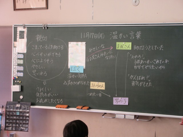 道徳で『温かい言葉』について考えました。教材文を読んで、『ぼく』の気持ちを考えました。登場人物の関係やそれぞれの思いを図に表しながら、『ぼく』の気持ちをより深く、いろいろな視点から考えるようにしました。