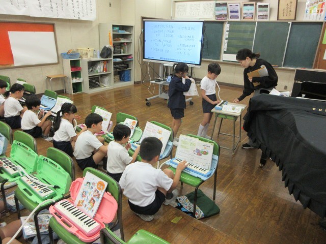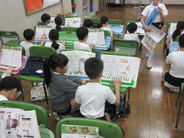 周年記念集会できれいな歌声を披露した2年生。音楽の時間には鍵盤ハーモニカに挑戦です。いくつか課題の曲があり、それを一所懸命に練習しています。指使いも難しいので、友達に教わっている子もいます。弾けるようになると、先制の所に行って、テストを受けます。それが合格すると次の曲にチャレンジしています。