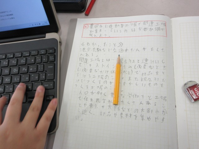 先生からは『学びポケット』というアプリを通して、関連工場の様子や、地図、グラフなどいろいろな資料が配られます。その中から自分が調べたい資料を選んで『なぜか?』に対して自分なりの答えを見つけていきます。中には、自分から地図帳を開いたり、HPを検索したり別の資料を活用する子もいます。自分から主体的に問題を解決できる富士っ子をめざしていきます。