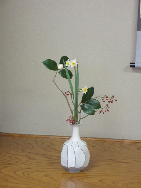 この日、いつもの和室はお茶室に変わりました。床の間には『山は呼ぶ、萬歳(ばんざい)の声』というお軸がかかっています。新しい年を明るく迎てほしいというお茶の先生の思いがこもっています。そして春を感じさせるスイセンとツバキの花。部屋に入るだけで、凛とした気持ちになります。