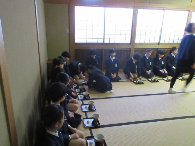 はじめに総礼をしてからお茶室の様子のお話を聞いて、茶道教室が始まりました。菓子、茶碗、茶せんを配るのは代表の児童です。配るときにお互いに礼をします。先生からは、『ただ頭を下げるのではなくて、ありがとうの気持ちを込めながら礼をしなさい。』というお話がありました。子供たちの感想の中に、お茶は『礼』が大切だというものがありました。子供たちはしっかりと学んでいます。