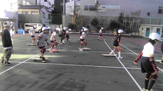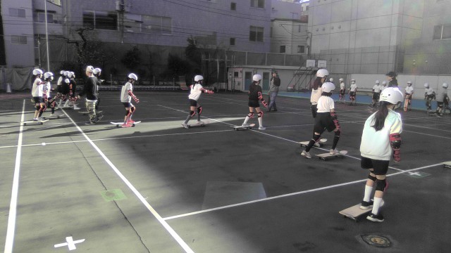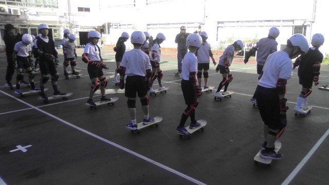 乗り方がわかると次はプッシュという技です。これは片足をボードに乗せて、もう一方の足で地面をけって進む技です。はじめはバランスもうまく取れずに、おっかなびっくりでやっていましたが、インストラクターの『前を向く』、『ボードの近くをける』、『ゆっくり』の3つを守って何回か練習するうちに、ひとけりでスーッと進むようになりました。だんだん、楽しくなってきたようで、みんな笑顔で練習をしていました。