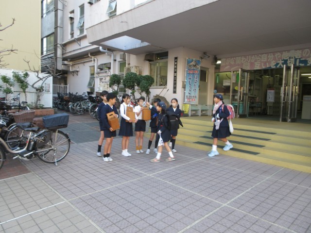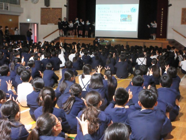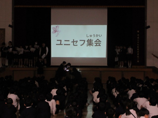 12月15日(月)の全校朝会で、代表委員会がユニセフの活動などについての説明をしました。クイズも交えながら、ユニセフの果たす大切な役割りをみんなに伝え、ユニセフへの募金を呼びかけました。そして、16日から18日まで登校時に玄関でユニセフ募金活動をしています。登校する子供たちがランドセルから募金袋を出して入れていきます。通勤途中の方も募金をしてくださいました。みんなの気持ちで世界の子供たちの力になれたらと、寒い中ですが募金活動をがんばっています。