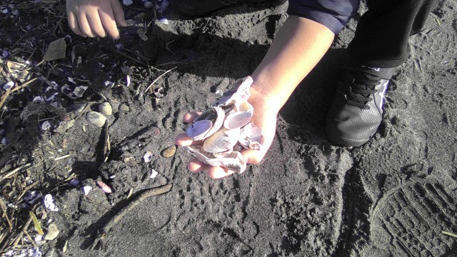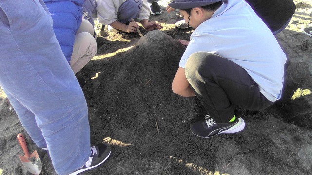 飾りに使う貝を集める子、絵や山を作る子、それぞれが分担して活動しています。みんな夢中です。