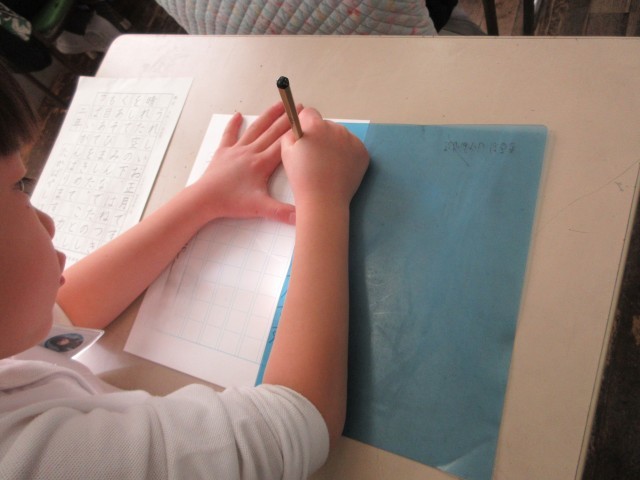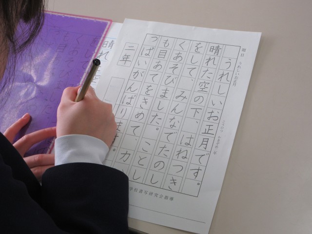 2年生は2回目の書き初め。硬筆で書くのはこれが最後になります。本番ということもあって、シーンとした緊張の中で、みんな一所懸命に書いていました。書き終わると緊張が解けて、フーッと息を吐いていました。1年生のときからいつもていねい字で書くことを心掛けていたので、どの子も字形の整った、力強い字を書きました。