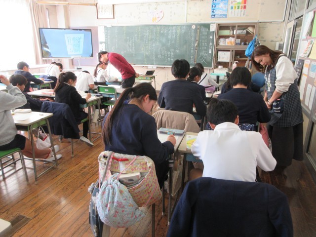 手紙と言っても、『拝啓 厳寒の候~』とはじまるとてもフォーマルな手紙の書き方です。はじめに教科書を使って、フォーマルな手紙文の形式について学習をしました。