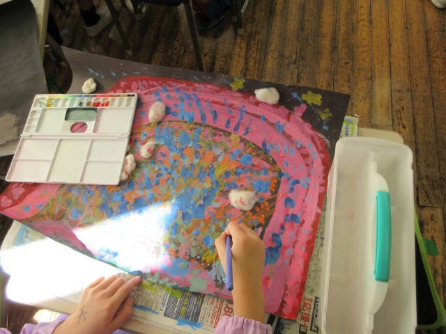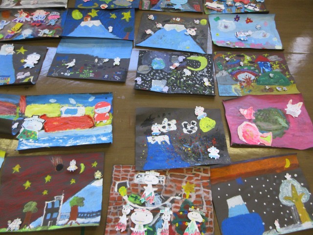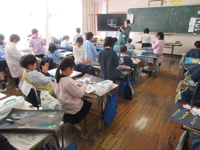 図工の時間に『進化したふじたん』というタイトルで、ふじたんを進化させた絵を描くことにしました。ふじたんそのものが姿を変えたり、すてきな場所に行ったり、子供たちのアイデアでいろいろなふじたんができました。自分のイメージに合わせて様々な色、模様を子供たちは工夫していました。ふじたんを描くことを通して、富士小学校への愛着をさらに高めていました。
