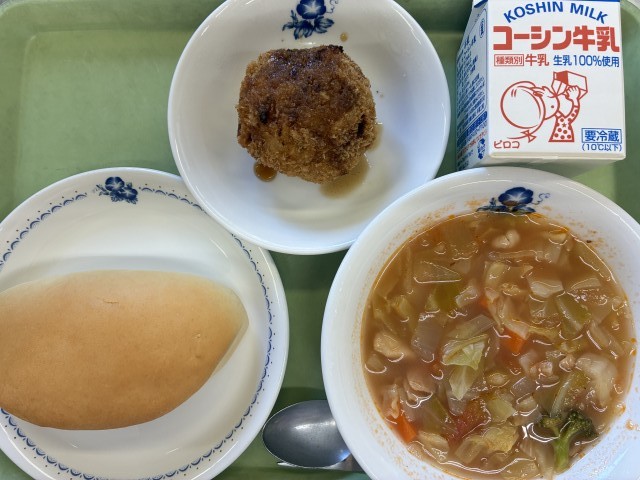 献立:牛乳、柏パン、おみくじコロッケ、ミネストラスープ