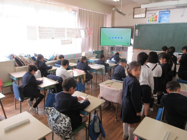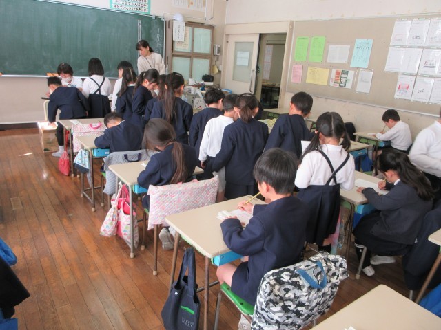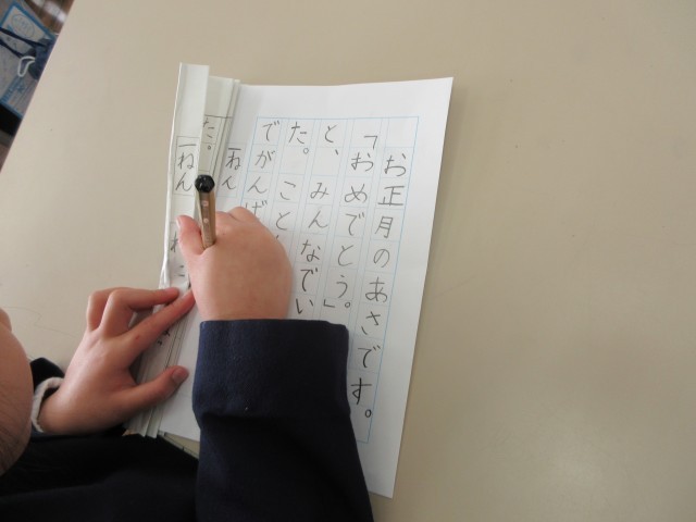 1年生、初めての書き初めは鉛筆で書きます。お手本をじっくりと見ながら、一字一字ていねいに書いていました。いい字を書くには姿勢も大事です。椅子を引いて、背筋を伸ばして書いていました。みんな緊張して一所懸命に書いているので、書き終わるとホッとした笑顔になります。