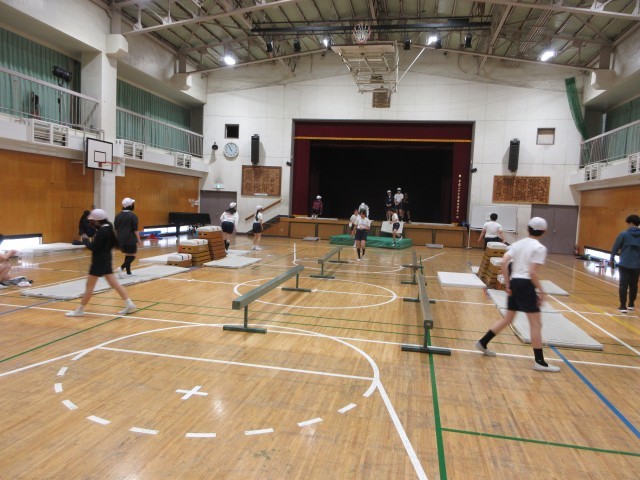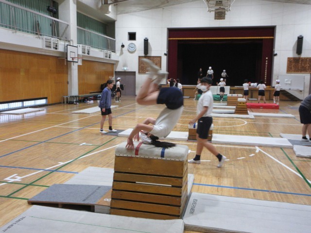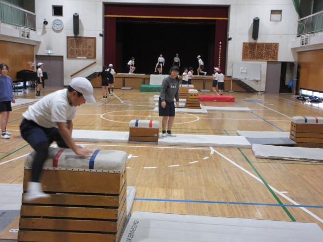 はじめに一番上の写真のように跳び箱、マット、平均台を配置し、サーキットトレーニングをします。手で強く押して腰を高く上げたり、手をしっかりと着いたり、ステージから前転でエバーマットの上に降りたり、跳び箱運動のもとになる動きを身に付けていきます。次にそれぞれのめあてに合った場を選んで練習していきます。台上前転、頭はね跳びなどの技にもチャレンジしています。小学校のうちにできる技をもう一つでも増やしたいですね。