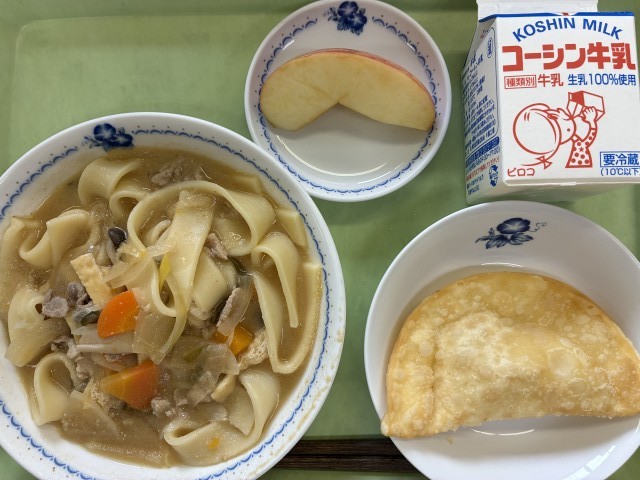 献立:牛乳、ほうとう、パリッとポテト、りんご