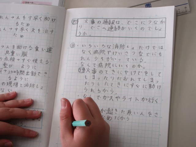 今日の課題は『火事の通報はどこにつながるのか?』です。教科書などの資料を読み取って、分かったことをノートにまとめていきます。