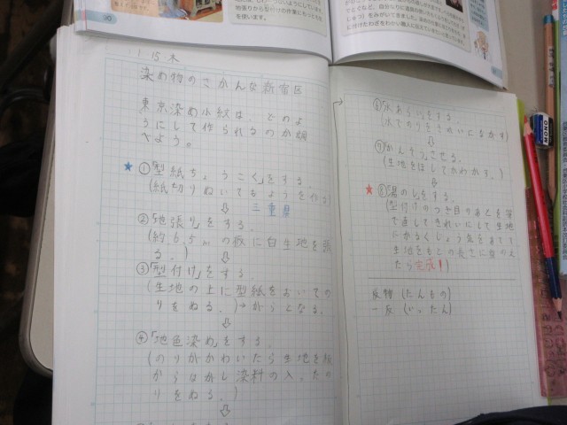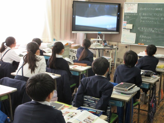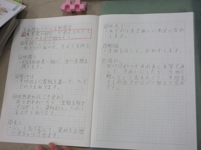 この日は江戸小紋ができるまでを調べました。一つ一つの工程について作業の内容などをノートにまとめました。教科書で調べたことを、動画を見て確かめました。みんな真剣に見入っていました。