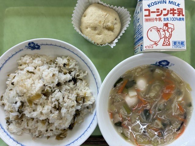 献立:牛乳、高菜飯、タイピーエン、いきなりだんご