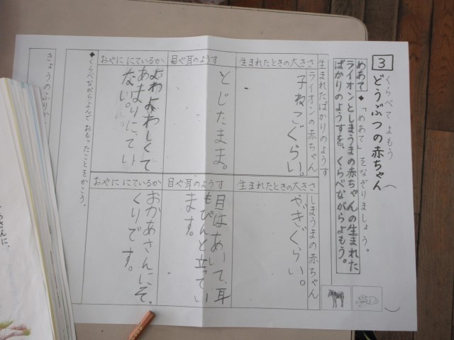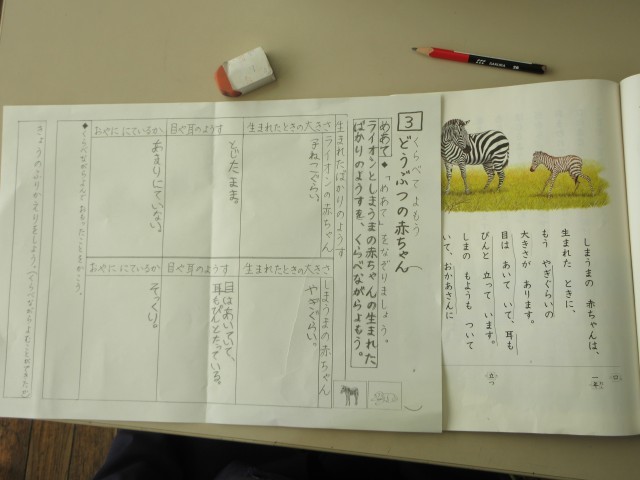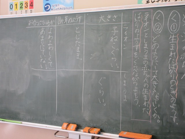 国語では『どうぶつのあかちゃん』という説明文を学習しています。このお話は、ライオンとシマウマの産まれたときの様子、成長の仕方などを比べて書いてある文章です。初めて自分の力で説明文に書いてあることを読み取っていきます。