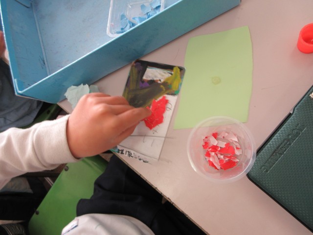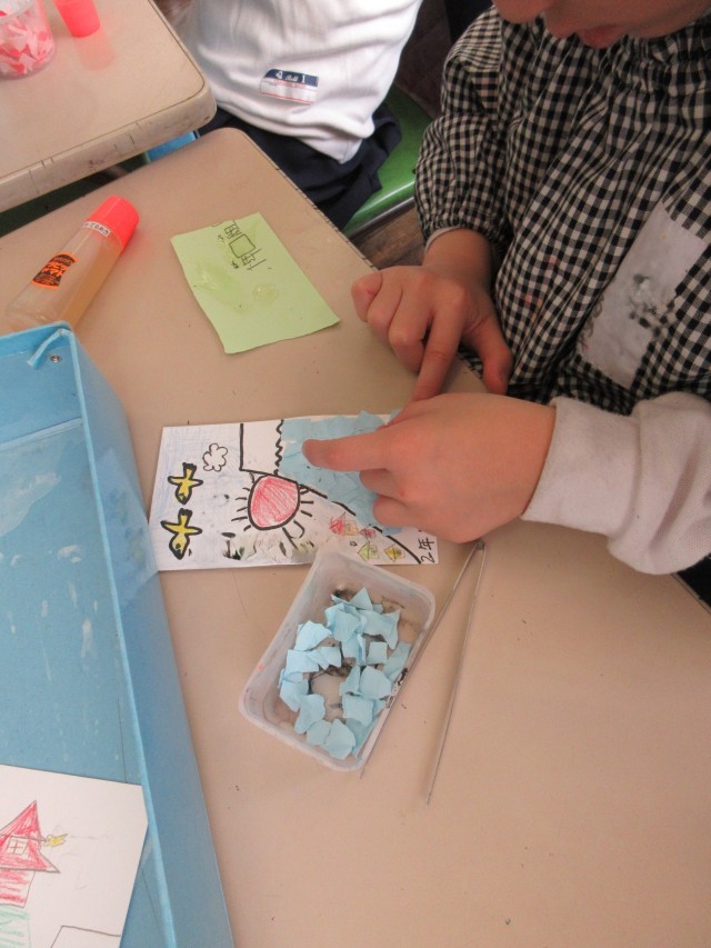 2年生は図工が大好きです。今日は小さなカードを作りました。富士山は貼り絵に、それ以外は絵の具や色鉛筆など自分の好きなもので絵を描きました。貼り絵は小さく切ったいろがみを、一枚一枚ていねいに貼っていました。みんな集中して取り組み、すてきなカードができ上っています。
