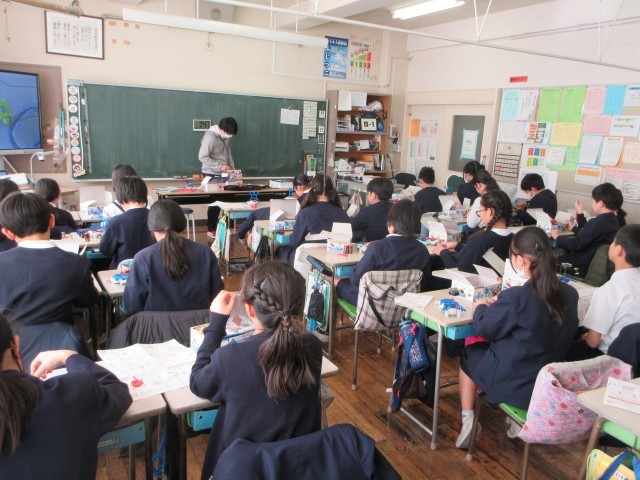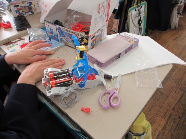 電磁石の学習は市販のキットを使って進めています。実験に入る前に、スイッチなどの装置を作ります。設計図を見ながら、正確に部品を組み立てていくのですが、そういった経験があまりない子供たちにとっては、これも大きな学びです。悪戦苦闘したり、友達と助け合ったりしながら組み立てていました。